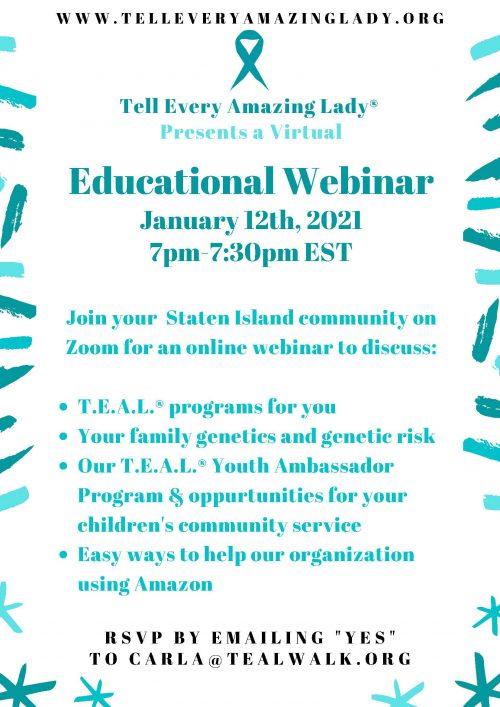 In the news The latest in Tell Every Amazing Lady® news, events, articles and important information about ovarian cancer. News T.E.A.L.® In the News T.E.A.L.® Walk/RUN™ Community Outreach All Search Search News March 8, 2021 T.E.A.L.® Legacy Board Member hosts International Women’s Day outreach event News March 8, 2021 T.E.A.L.® attends St. Francis College Virtual Career Fair Community Outreach March 5, 2021 T.E.A.L.® participates in NYU Global Public Health Career Expo News February 21, 2021 T.E.A.L.® attends Lions 20-K1 Mid-Winter Convention virtually News February 3, 2021 T.E.A.L.® shares story at NewYork-Presbyterian quarterly meeting News January 27, 2021 T.E.A.L.® board member hosts outreach event Community Outreach January 27, 2021 T.E.A.L.® speaks at Forbes outreach event Community Outreach January 27, 2021 T.E.A.L.® attends BBB Accredited Business Networking Event News January 26, 2021 T.E.A.L.® attends Jumpstart Virtual Event Networking Event Job Fair News January 12, 2021 T.E.A.L.® educates Staten Island community online T.E.A.L.® In the News December 28, 2020 T.E.A.L.® funds medical research study at Johns Hopkins School of Medicine News December 1, 2020 Dime Community Bank donates to T.E.A.L.® News November 20, 2020 Comedians host virtual comedy fundraiser for T.E.A.L.® News November 6, 2020 T.E.A.L.® raises awareness with young women from NYU News November 5, 2020 T.E.A.L.® Spotlight: Emilee Marshall News October 29, 2020 T.E.A.L.® presents in Russell Investment webinar News October 24, 2020 Tell Every Amazing Lady® holds virtual day of wellness News October 23, 2020 T.E.A.L.® attends Drew University virtual career fair News October 23, 2020 T.E.A.L.® talks with students in health and science News October 8, 2020 T.E.A.L.® connects with young professionals during virtual networking event Prev Page1 … Page16 Page17 Page18 Page19 Page20 … Page61 Next