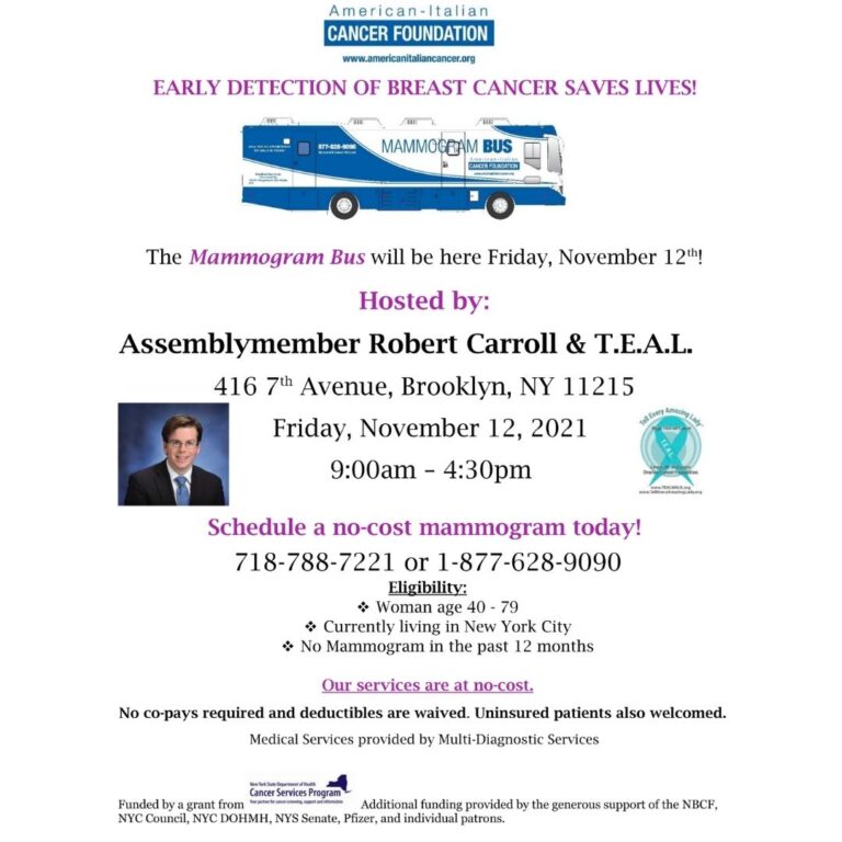 T.E.A.L.® staff set up an educational table during Assemblymember Robert Carroll’s no-cost mammogram event at his Seventh Avenue office in Brooklyn on November 12th, 2021 to connect with the community and raise awareness about the foundation and ovarian cancer. Those with a family or personal history of breast cancer can be at risk for ovarian cancer.