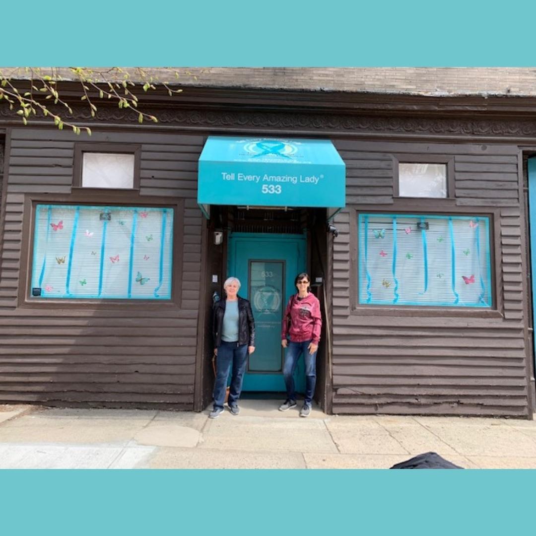 T.E.A.L.® volunteers Patsy and Carolyn donated their time, supplies, and creativity on April 18, 2021 to create a beautiful window display for the T.E.A.L.® Community Center. The windows were accented with teal lace, ribbons, and butterflies to highlight the spring season. (Notice the budding tree in the photo!) We are so grateful for their artistic touch at our center!