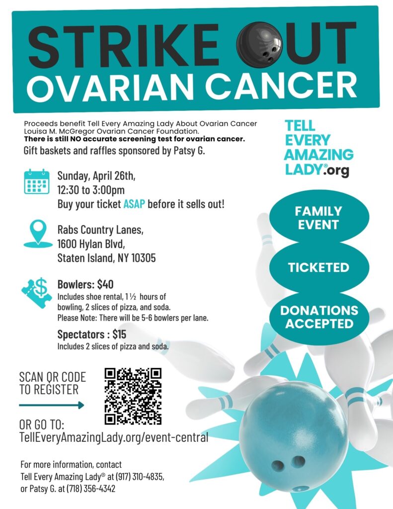 Our Strike Out Ovarian Cancer bowling event is happening on Sunday, April 26th, 2026 at Rabs on Staten Island!